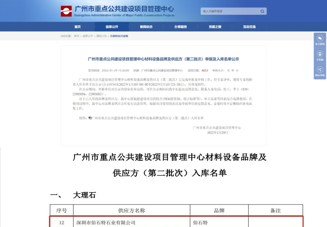 喜訊:深圳市佰石特石業(yè)有限公司入庫(kù)廣州市重點(diǎn)公共建設(shè)品牌項(xiàng)目!