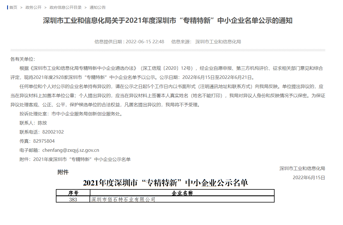 近日,深圳市工業(yè)和信息化局公示了2021年度深圳市“專精特新”中小企業(yè)名單。佰石特石業(yè)成功獲得深圳市“專精特新”企業(yè)認(rèn)定,象征著佰石特石業(yè)在行業(yè)內(nèi)的快速高效發(fā)展,也是佰石特石業(yè)發(fā)展的重要里程碑之一。